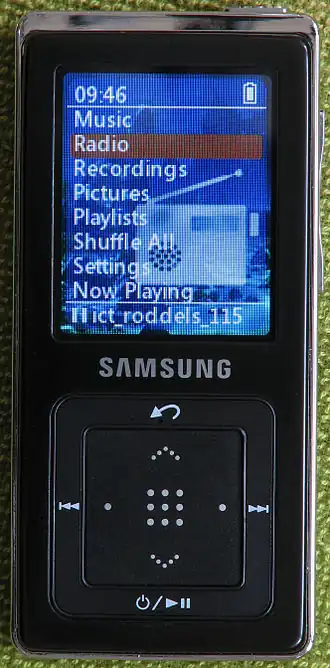 - Een radio. Dat is altijd een FM-radio. Voor de middengolf is een spoel nodig die rond een ferrietstaaf is gewikkeld (of een heel lange antenne) en dat is te groot voor zo'n klein apparaat. Ook zou de (digitale) elektronica goed afgeschermd moeten worden, omdat de stoorsignalen anders door de middengolf-antenne opgepikt worden.