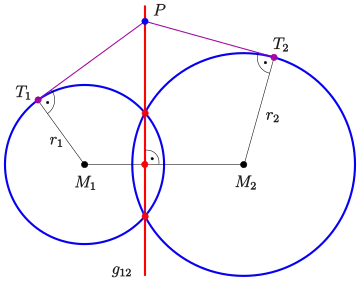 Als de cirkels snijden, dan hebben deze snijpunten macht nul ten opzichte van beide cirkels, en verbindt de machtlijn dus deze snijpunten. Evenzo, als de twee cirkels raken, dan is de machtlijn hun gemeenschappelijke raaklijn in dit raakpunt.