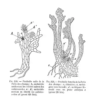 Bij paardenstaarten groeit de gekiemde spore uit tot een onregelmatig gevormd, betrekkelijk kleinblijvend, groen prothallium (of voorkiem). Het blijkt dat de helft van de sporen mannelijke prothallia oplevert, de andere helft groeit uit tot vrouwelijke prothallia. De antheridia zijn verzonken in het thallus en ook de archegonia liggen wat verdiept en hebben een kortere hals dan bij de mossen. Na de bevruchting groeit de nog binnen het archegonium liggende zygote uit tot een uit een spruit en een wortel bestaande sporofyt, die zelfstandig gaat leven.