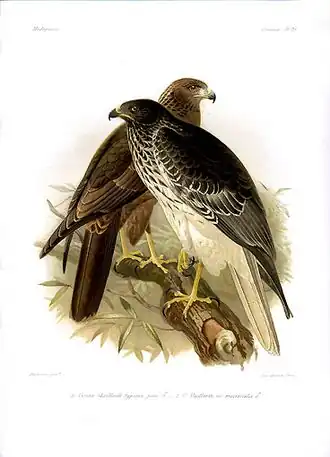 | Madagaskarkiekendief. Voor: mannetje; achter: vrouwtje. Illustratie door John Gerrard Keulemans uit Histoire Naturelle des Oixeaux de Madagascar, Paris, Imprimerie Nationale, 1876–85. | |||||||||||||