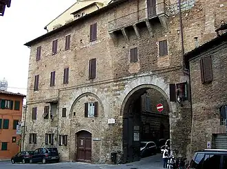 - ↑ Meestal de Arco delle Due Porte genoemd, een van de twee resterende stadspoorten van Siena.