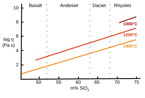 Het silicaat-ion vormt op moleculaire schaal een tetraëder, waarbij een silicium-ion omringd wordt door vier zuurstofionen. In silicaten met een hoog gehalte aan SiO2 zullen de tetraëders ketens vormen, waarbij één of meerdere zuurstofionen op de hoeken van de tetraëders gedeeld worden. In een magma zitten de tetraëders natuurlijk niet vast, maar de moleculaire structuur in de smelt benadert de structuur van vaste stoffen met vergelijkbare samenstelling, wanneer de temperatuur tot vlak boven het smeltpunt daalt. In een relatief koel magma vormen de silica-tetraëders daarom vaak losse bindingen. In een mafischer magma is minder silica aanwezig dan in een felsischer magma, zodat de silica-tetraëders vaker los liggen. Dit maakt een felsisch magma viskeuzer (stroperiger) dan mafisch magma; en relatief koel magma stroperiger dan relatief heet magma. Wanneer de eerste mineralen uitkristalliseren, ontstaat een mengsel van magma en kristallen, dat zich nog stroperiger gedraagt.[2]