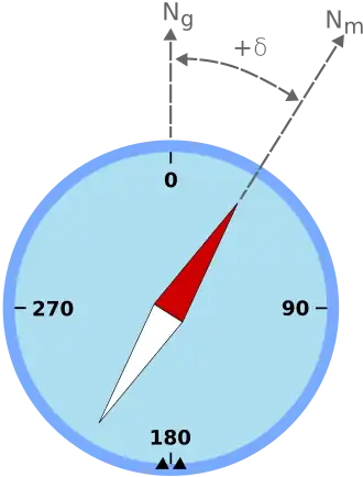 Oriënteert men zich met een kompas op de richting van de geomagnetische pool, dan is er afhankelijk van de locatie op aarde een verschil met de richting van de geografische pool. Dit verschil, de magnetische declinatie, is niet steeds hetzelfde, maar hangt af van waar op aarde men zich bevindt.
