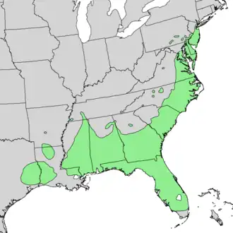 De soort komt voor van Texas tot in het oosten van de Verenigde Staten en op het eiland Cuba.[2] Hij groeit daar in natte zure zandige onvruchtbare bodems en moerassen op lage hoogten. Komt verder ook voor in moerassen, baaien, lage natte bossen en savannes, voornamelijk in kustvlaktes en lagere heuvels van zeeniveau tot 540 meter hoogte.