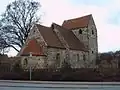 Achterkant van deze kerk met geheel rechts, tegen de muur aan, een menhir -