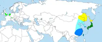Verspreidingsgebied van de mandarijneend ■ broedgebied (geel)