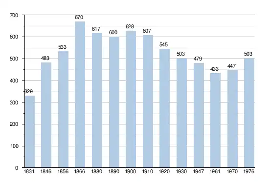 - Bronnen:NIS, Opm:1831 tot en met 1970=volkstellingen, 1976= inwoneraantal op 31 december