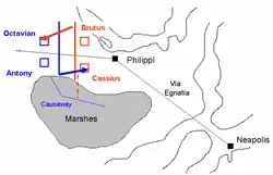De volgende slagen zijn als de slag bij Philippi de geschiedenis ingegaan als de grootste slag tussen Romeinse legioenen ooit. Brutus en Cassius waren in de minderheid, maar hun admiraal Ahenobarbus, die vroeger onder Pompeius diende, beheerste de zee met een vloot van 130 schepen. Zo konden Brutus en Cassius over zee bevoorraad worden en Antonius en Octavianus niet. De strategie van Cassius en Brutus bestond er daarom in om te wachten en te verdedigen totdat Antonius en Octavianus door hun voorraden zouden heen zijn.
