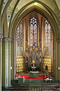 De naar het zuiden gerichte drieschepige hallenkerk werd in neogotische stijl gebouwd en heeft de typische kenmerken van de gotiek: o.a. buiten de steunberen, de hoge spitsbogige vensters en een kruisribgewelf met een ringvormige sluitsteen. Het kerkschip heeft een lengte van 56,5 meter en een breedte van 34,5 meter. De toren met een grondoppervlak van 8 bij 8 meter is 60 meter hoog. Het muurwerk bestaat uit lavasteen en is in de basis met tufsteen bekleed.