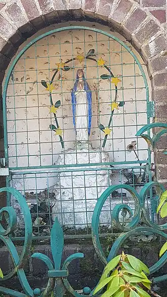 In de frontgevel is de wit geschilderde kapelnis aangebracht en bestaat uit een gemetselde bakstenen rondboog die met hekwerk wordt afgesloten. In de nis staat op een witte sokkel het Mariabeeldje. Het beeldje toont een biddende Maria die omhoog kijkt met haar handen gevouwen en in het wit gekleed een blauwe mantel draagt. Rond het beeld is een hoefijzervormige boog aangebracht waarop negen gele sterren en acht groene blaadjes geplaatst zijn.[1][2]