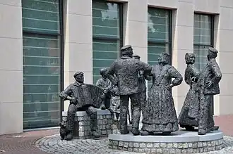 De Klepperman van Elleven. Beeldengroep van 8 dansers, naar voorbeeld van de Larense folkloristische dansgroep "De Klepperman van Elleven". Vóór de Rabobank, Burgemeester van Nispenstraat, Laren.