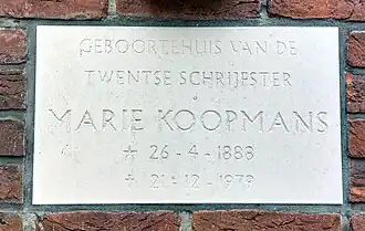 - ↑ a b c d e Martin Paus (11 februari 2022). Marie Koopmans, de Twentse schrijfster. N.V. Uitgeverij Smit Van 1876, pp. 8-30. ISBN 9062895743.