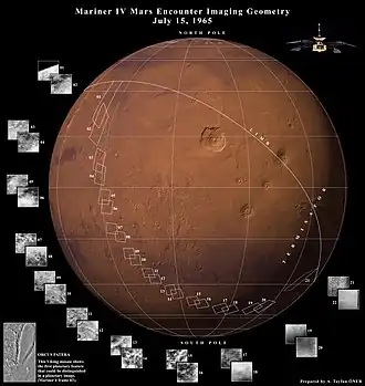 Mariner 4 nam 21 foto's terwijl hij langs Mars vloog, de kortste afstand tot de planeet bedroeg 9600 km.[3] Door de grote afstand was het niet mogelijk de beelden rechtstreeks over te seinen. In plaats daarvan legde de verkenner iedere foto vast op band om later te verzenden. Voor de zekerheid gebeurde dit met iedere foto twee keer, nadat de sonde weer vanachter de planeet was opgedoken. Het overseinen duurde tot 3 augustus.[4] De opnames toonden een landschap dat was bedekt met kraters, die veel weg hadden van die op de maan. Astronomen namen na bestudering van de foto's aan, dat de gehele oppervlakte van Mars er zo uitzag. Dit bleek tijdens latere missies echter niet het geval. Door toeval fotografeerde Mariner 4 alleen kraterachtige terreinen. De Mariners 6, 7 en 9 toonden later aan dat op de rode planeet tevens grote kloven, diepe ravijnen, imposante vulkanen en uitgestrekte vlakke gebieden met geen of weinig detail voorkwamen.[5][6] Mariner 4 vond geen van de in vroeger tijden veelvuldig vanaf de aarde waargenomen kanalen en toonde evenmin de aanwezigheid van vloeibaar water aan.[2]