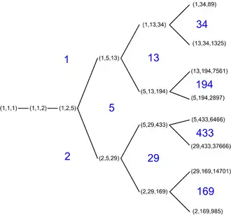 De oplossingen van de vergelijking kan men in een binaire boom voorstellen. Elke oplossing is daarbij de "ouder" van twee verschillende oplossingen die volgens het hierboven beschreven mechanisme eruit zijn afgeleid (met of zonder permutatie).