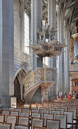 De kansel van zandsteen dateert uit 1541 en werd in het atelier van Nickel Hoffmann gemaakt. Het rijk bewerkte houten klankbord stamt uit 1596 een heeft de vorm van een achthoekige ster met daarboven een kleinere achthoekige ster op acht zuiltjes. Helemaal boven bevindt zich het beeld van de verrezen Christus.