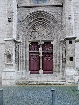 Het spitsbogige zandstenen westelijke portaal vormt de hoofdingang van het kerkgebouw. Als versiering van het portaal is ter vermaning van de gelovigen het motief van het Godsgericht aangebracht. Het noordelijk portaal werd door de school van Peter Parler uit Praag ontworpen en heeft als motief de Kruisiging. De oorspronkelijke beschildering van de portalen, beelden en binnenmuren zijn in latere tijd verloren gegaan.