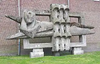De kerktoren werd in de Tweede Wereldoorlog op 27 oktober 1944, de dag van de bevrijding van de stad, opgeblazen door het Sprengkommando van de Duitse bezetters. Er werd een noodgevel gebouwd die tot 1961 bleef staan. In 1961 werd er een voorgevel voor in de plaats gezet. Deze constructie werd ontworpen door Th. Taen en Th. Nix. Boven de ingang was een kunstwerk in de voorgevel geplaatst. Het kunstwerk van gegoten beton werd in 1962 gemaakt door B.J.M. Welten. Het beeld stelt een liggende Christusfiguur voor met negen van de negentien martelaren van Gorcum, gesymboliseerd door monnikspijen.[1] De voorgevel contrasteerde met de rest van het gebouw en het kunstwerk liet veel aan de verbeelding over.