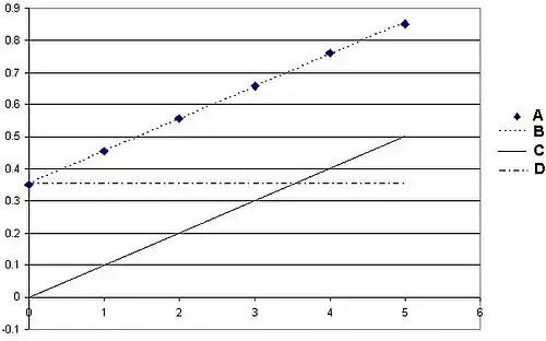 | Bij de grafiek: A = de serie meetpunten; B = de beste lijn door de meetpunten Excel; C = de beste lijn zonder de bijdrage van het monster; D = het signaal van het monster. Via Excel is uit te rekenen dat de concentratie monster 3,48 ppm moet zijn. | ||||