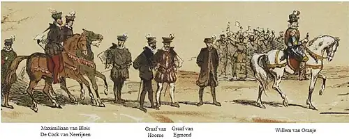 Voor het driemanschap Oranje, Egmond en Horne was het te riskant om zich openlijk tegen de besluiten van de koning te keren. Zij lieten dit over aan enkele vertrouwelingen. De voornaamste onder hen waren Van Marnix, een gunsteling van de Prins van Oranje en Maximiliaan de Cock van Neerijnen, edelman en vertrouweling van de Graaf van Egmond[8]. In december 1565 organiseerden zij een geheime bijeenkomst in het paleis van de graaf van Culemborg in Brussel. Hier werd voorgesteld om een bond van edelen op te richten tegen de strenge geloofsvervolging. In de loop van december vond in de woning van Nicolaas de Hames, heraut van het Gulden Vlies in Brussel een tweede bijeenkomst van edelen plaats. Tijdens deze bijeenkomst werd de oorkonde van het Eedverbond opgesteld met het doel van deze bond: opheffing van de inquisitie en verzachting van de plakkaten. Maximiliaan zou een van de eerste edelen zijn die dit document ondertekende. De oorkonde en afschriften werden nu ook ter tekening doorgezonden aan Lodewijk van Nassau en Hendrik van Brederode. Uiteindelijk zouden ruim 500 edelen, waaronder katholieken, het Compromis ondertekenen. Natuurlijk waren er ook edelen, zoals Jean de Ligne graaf van Arenberg die dit weigerde en het Spaanse gezag bleven steunen. Samen met de graaf van Megen lichtte Egmont de landvoogdes Margaretha in over het Eedverbond der Edelen.