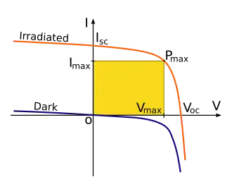 • de raaklijn aan de zonnepaneelkarakteristiek loopt parallel aan de verbindingslijn van UMPP naar IMPP (punten op de I-as (verticaal) en de U-as (horizontaal).