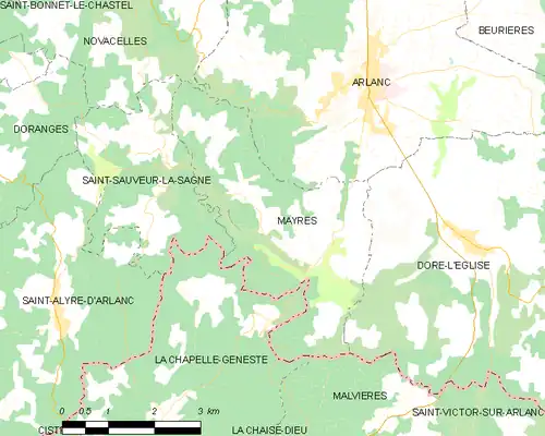 De onderstaande kaart toont de ligging van Mayres (Puy-de-Dôme) met de belangrijkste infrastructuur en aangrenzende gemeenten.