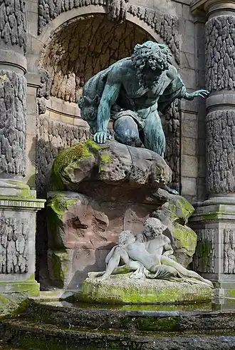 De nissen zijn gevuld met beeldhouwwerken van Auguste Ottin. Centraal creëerde hij de beeldengroep Polyfemos verrast Akis en Galateia (1866). Vanop een rots ziet de cycloop Polyfemos hoe Akis en de nimf Galateia aan het liefkozen zijn. In het verhaal van Ovidius zal hij hen met een rotsblok verpletteren. Polyfemos is uitgevoerd in brons, Akis en Galateia in wit marmer. In 1874 toonde Ottin een gereduceerde bronzen versie van het paar op de Eerste tentoonstelling van de impressionisten. Voor de zijnissen creëerde hij beelden van Pan en Diana.