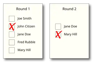 Bij een tweerondensysteem vinden er twee ronden plaats waarin kiezers hun stem uit kunnen brengen. Bij de eerste ronde wordt er doorgaans gebruik gemaakt van het FPTP-systeem, vaak in de Winner Takes All-vorm.[10] Wanneer een kandidaat in de eerste ronde al een (absolute) meerderheid van de stemmen behaalt, is er geen tweede ronde nodig.[11] Wanneer dit niet het geval is, wordt er gebruik gemaakt van de tweede stemronde, doorgaans op een latere datum (bijvoorbeeld een week later).