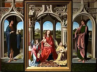 Het werk was een kopie van een werk van Hans Memling uit ca. 1500: Tronende Madonna met Kind en Heiligen. De kopie is deels getrouw nagemaakt maar ook aangepast aan de smaak van de periode. Het landschap op de achtergrond is echter ruimer opgezet en de invulling van de architectuur geeft meer perspectief. De opdrachtgever van het origineel, in het zwart rechts van de Madonna, werd vervangen door een luitspelende engel.