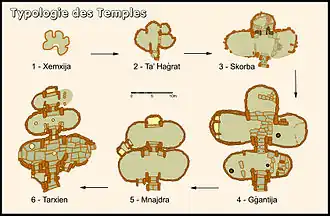 Het grootste verschil tussen de tempels onderling ligt in het aantal apsissen, variërend van drie tot zes. Waar het er drie zijn komen die rechtstreeks in klaverbladvorm uit op het centrale hof.[29] Bij meer complexe tempels is een aparte axiale passage gemaakt volgens hetzelfde trilithonpatroon, die leidt van de apsis vooraan naar een dubbele die eraan is toegevoegd en een vijfde centrale apsis of soms een nis waardoor de constructie met vier of vijf apsissen ontstaat. In de centrale tempel van Tarxien is die vijfde apsis of nis vervangen door een volgende doorgang, die naar een laatste paar apsissen leidt, zodat het totaal op zes uitkomt.[30]