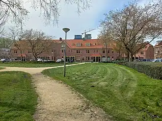 De buurt staat bekend als de Bloemenbuurt in de Van der Pekbuurt en dat geeft dan direct een indicatie voor wat voor soort woninkjes hier staat. Jan Ernst van der Pek ontwierp voor de gehele wijk arbeiderswoningen, zo ook hier. Het zijn portiekwoninkjes van twee bouwlagen en daarop een zolder onder het puntdak met dakpannen. Ook de kleurstelling van de woningen wijkt niet af: bruinrood baksteen, mosterdgele accenten in houtwerk en groene deuren. Uiteraard behoort de totale symmetrie ook hier tot het uitgangspunt. Midden in het plantsoen staat echter een gebouw, wel in dezelfde stijl maar dan van een architect van de Dienst der Publieke Werken. De woningen worden qua architectuur hoog ingeschat (orde 2, bijna monument), het pand midden op het plein, origineel een leeszaal, minder (orde 3, moeite van het bewaren waard). De woningen zullen een aantal keren gerenoveerd zijn, want ze moesten steeds aangepast worden aan modernere wensen en eisen.
