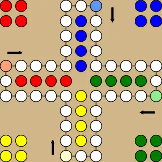 Elke speler heeft pionnen van een eigen kleur, een eigen beginpunt, en eigen eindcirkels waar andere pionnen niet mogen komen. De spelers gooien om beurten met een dobbelsteen en moeten een van hun pionnen met de klok mee het aantal cirkels verplaatsen dat de worp aangeeft. Als men een pion heeft aangeraakt is de keuze definitief en moet deze pion verplaatst worden. Wanneer een pion op een cirkel komt waar al een andere pion staat, dan wordt deze afgegooid (geslagen). Een afgegooide pion moet weer opnieuw in het spel worden gebracht en van voren af aan zijn ronde maken.