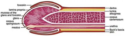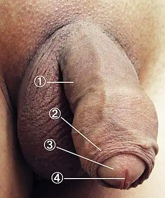 De menselijke penis bestaat uit drie zwellichamen: twee aan weerszijden bovenin (de corpora cavernosa – enkelvoud: corpus cavernosum), en één aan de onderzijde van de penis (het corpus spongiosum). Deze derde is groter dan de eerste twee en kegelvormig. Hij vormt aan de voorzijde van de penis de zeer gevoelige eikel (glans penis). Tussen de eikel en het corpus van de penis bevindt zich een groef, het collum glandis. Aan de basis van de eikel zijn er kliertjes die talg produceren, de glandulae praeputiales. De eikel wordt beschermd door de voorhuid (preputium): een losse huidflap die naar achteren kan schuiven en daarbij de eikel vrijlegt. Om verschillende culturele, religieuze en medische redenen wordt de voorhuid soms gedeeltelijk of geheel verwijderd; dit wordt besnijdenis of circumcisie genoemd. De eikel wordt met de voorhuid verbonden door het toompje (frenulum). Dit is meestal de meest gevoelige plek van de penis.