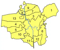 Stadsdelen in de eigenlijke stad (het op het onderste kaartje ongenummerde gebied in het midden) zijn:
