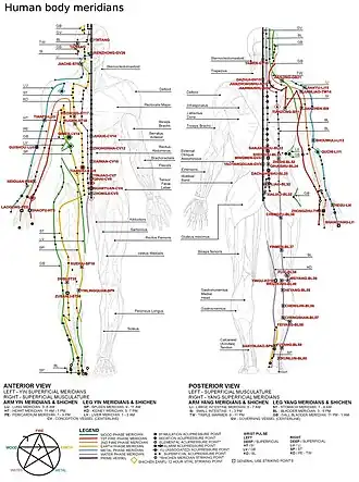 De publicatie Standard acupuncture nomenclature van de Wereldgezondheidsorganisatie heeft een lijst van ongeveer 400 acupunctuurpunten en 20 meridianen die vrijwel al deze punten verbinden.