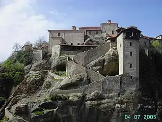 Het huidige klooster werd gebouwd ± 1490, maar volgens deskundigen boven op de overblijfselen van een ouder klooster. Bouwkundige kenmerken en resten van muurschilderingen wijzen er op dat de kerk stamt uit de 13e/14e eeuw. Omdat de top van de rots waar het op staat klein en smal is, zijn de kloostergebouwen niet horizontaal uitgebreid, maar verticaal, in verschillende verdiepingen. Zo staan de kloosterkerk en de refter op de eerste, de cellen van de monniken op de tweede verdieping. Opvallend zijn de bescheiden afmetingen van de kloostergebouwen: er was slechts plaats voor tien cellen. De centrale kloosterkerk is toegewijd aan de heilige Nikolaas. Het smalle gebouw, met een lage koepel zonder ramen (want er ligt nog een verdieping boven), werd begonnen enkele jaren voor 1510 en voltooid in 1527. De muurschilderingen zijn uitgevoerd door de monnik-kunstschilder Theophanis Strelitzas uit Kreta: hoewel de beperkte ruimte technische problemen opleverde, slaagde hij er toch in het iconografische programma, zoals dat in de tijd van de Paleologen-keizers (1259-1453) vorm had gekregen, volledig uit te voeren.