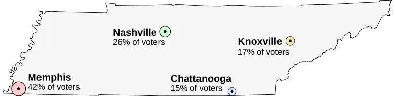Laten we zeggen dat in een verkiezing, de kiezers kiezen gebaseerd op de geografische nabijheid. Aannemende dat de bevolkingsverdeling van de rest van Tennessee volgt uit deze bevolkingscentra, is een verkiezing met de volgende percentages een mogelijkheid: