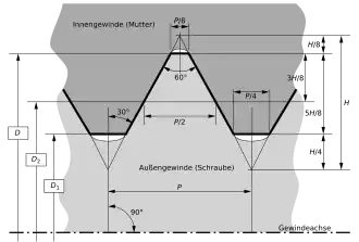 Metrisch schroefdraad is V-vormig en wordt gekenmerkt door de buitendiameter en de spoed P, de axiale afstand tussen twee windingen. Dwars op de schroefrichting maken de hellingen van de V een hoek van 60° met elkaar. De top van de V van uitwendig draad is afgeknot met 1/8 van de hoogte H en van inwendig draad met 1/4 van de hoogte. De diepte van de draad is 0,54125 van de spoed.