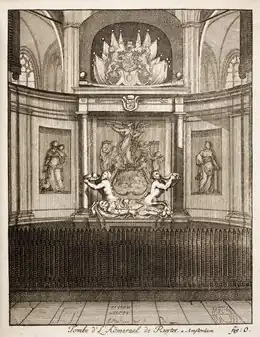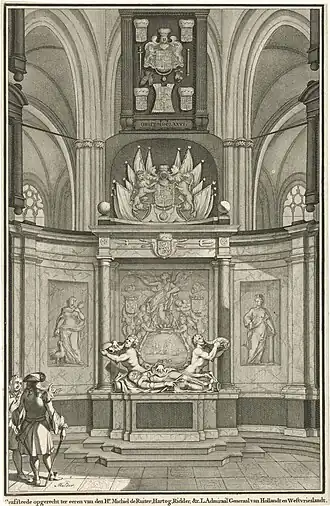 Op 18 maart 1677 werd de gesneuvelde admiraal begraven onder de plaats van het vroegere altaar in de Nederlands Hervormde Nieuwe Kerk in Amsterdam. De Amsterdamse hoogleraar Petrus Francius droeg bij die gelegenheid een Latijns afscheidsgedicht van bijna duizend hexameters voor. Het in 1681 voltooide praalgraf, ontworpen en gemaakt door de Vlaamse beeldhouwer Rombout Verhulst, is te bezichtigen in de Nieuwe Kerk.