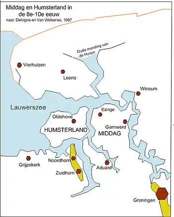 De inbraken van de zee via de monding van de Lauwers veroorzaakten brede inhammen in het kweldergebied ten noorden en westen van Middag, waardoor het een schiereiland werd. De noordelijk gelegen zeeinham bereikte het stroomdal van de Hunze, waardoor deze rivier sindsdien vanaf Schouwerzijl naar het westen stroomde in plaats van naar het noorden. Het westelijk van Middag gelegen Humsterland werd zelfs helemaal een eiland. Middag en Humsterland werden gescheiden door de Kliefsloot. Deze zeearm had de Middagster Riet doorsneden en zo deze rivier van haar bovenloop (de Oude Riet) beroofd. In het landschap van Middag is de dode bedding nog steeds herkenbaar. Vanaf Fransum kronkelt het stroomdal langs Beswerd noordwaarts om bij Allersma het huidige Reitdiep te bereiken.