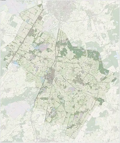 | Gemeentegrenzen Wijkgrenzen Buurtgrenzen Autosnelweg Secundaire weg Spoorweg | ██ Geselecteerde gemeente ██ Bebouwd gebied ██ Bos of park ██ Binnenwater, rivier of kanaal |