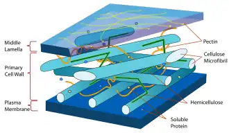 De celwand bestaat van buiten naar binnen uit verschillende lagen: de middenlamel, de primaire en de secundaire celwand. Binnen de celwand, om de protoplast, ligt de celmembraan.
