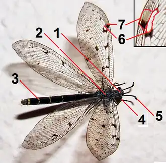 De vleugels zijn te onderscheiden van die van andere insecten door de aanwezigheid van een relatief zeer lange hypostigmatische cel. Dit is een vergrote en langwerpige cel in iedere vleugel. Het hypostigma is gelegen in de buurt van de vleugelpunt of apex. Veel soorten die sterk op elkaar gelijken kunnen onderscheiden worden aan de relatieve lengte en hoogte van deze cel.[10] Fossielen van insecten bestaan vaak uit alleen een vleugel of zelfs slechts een afdruk hiervan. Hierdoor is het hypostigma eveneens een belangrijk identificatiekenmerk voor fossiele mierenleeuwen.[5] Een aantal soorten heeft ook een donker vlekje aan de bovenste vleugelrand, dat het pterostigma wordt genoemd. Het oppervlak is verdikt waardoor het pterostigma zwaarder is en het zwaartepunt van de vleugel verlegd. De aanwezigheid en de vorm en positie van het pterostigma kan karakteristiek zijn voor de soort.[10]