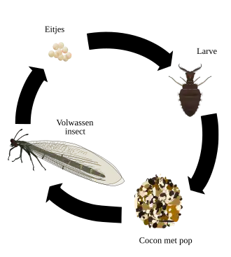 De beschermende cocon om de pop wordt gesponnen van een fijn spinsel. Net als bij andere netvleugeligen wordt het spinsel geproduceerd door de buis van Malpighi aan de achterzijde van het lichaam. Bij larven van andere insecten zoals de rupsen van vlinders bevinden de spinklieren zich aan de kop.[11] Het spinsel van de cocon droogt snel, maar is net als het ei kleverig zodat zandkorrels blijven plakken en de cocon goed wordt gecamoufleerd.