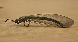 | Myrmeleon acer met grote, op de rug gevouwen vleugels, grote ogen en dikke, gekromde antennes. | |||||||||||