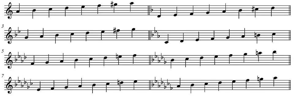 Grondtoon, hele toon (grote secunde), halve toon (kleine terts), hele toon (kwart), hele toon (kwint), halve toon (kleine sext), anderhalve toon (grote septiem), halve toon (octaaf).