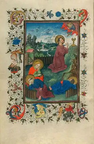 | V | M | p120 | Jezus wake in de Hof van olijven | Florale rand met onderaan een aapje dat met een groteske vecht. In de linkermarge ziet men een pelikaan die zijn jongen voedt met zijn eigen bloed, een symbool voor het offer van Christus. | |
