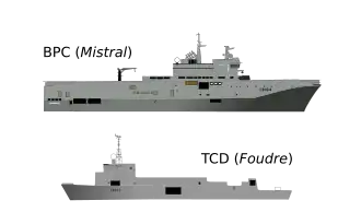 Er werden schepen van verschillende groottes voorgesteld, met waterverplaatsingen van 8000, 10.000, 13.000 en 19.000 ton en lengtes van 102, 125, 151 en 190 meter. Er werd voor de grootste gekozen. Frankrijk werd hiermee het derde land dat amfibisch transportschepen met een doorlopend helikopterdek en een groot dok bezat, na Italiës San Giorgioklasse en de Amerikaanse Waspklasse. De eerste plannen waren voorzien op verticaal opstijgende gevechtsvliegtuigen als de Harrier en de in ontwikkeling zijnde F-35, maar dergelijke vliegtuigen waren geen vereiste voor defensie, en de voorzieningen ervoor werden geschrapt.