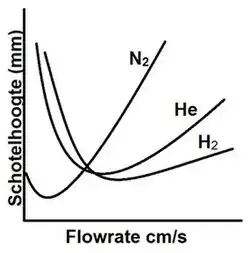 Stikstof is bijvoorbeeld alleen accuraat bij een lineaire stroomsnelheid rond de 12 cm/s.(zie afbeelding 4). Als de stroomsnelheid hoger wordt, neemt de schotelhoogte relatief meer toe dan bij helium en waterstof het geval is. Hierdoor neemt de efficiëntie af van de scheiding. Bij waterstof kan de lineaire stroomsnelheid op 35 cm/s gezet worden voor dezelfde kwaliteit scheiding. Het draaggas Helium zit qua prestaties hier tussenin. Een hoge lineaire stroomsnelheid betekent dat analyses korter duren, wat handig is als er veel metingen gedaan moeten worden.