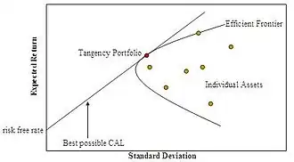 De grafiek geeft het verwacht rendement aan ten opzichte van de standaarddeviatie. Elke mogelijke combinatie van risicovrije en risicohoudende activa kunnen in deze grafiek worden getoond. Naar de hyperbool wordt dikwijls gerefereerd als: 'Markowitz Bullet', en is de efficiënte grens wanneer een risicovrij actief beschikbaar is. In een portefeuille met enkel risicovrije activa is de rechte lijn de efficiënte grens van de portefeuille. Een portfolio die op de efficiënte grenslijn ligt weerspiegelt de combinatie van de best mogelijke risico-rendement balans voor een risiconiveau, geuit in Standaard Deviatie () De raaklijn van de hyperbool geeft de best mogelijke risicovrije optie aan. Deze lijn wordt de 'Capital Allocation Line genoemd' CAL, logischerwijs krijgt een CAL met een hogere hellingcoefficiënt de voorkeur boven een met een lagere, dit houdt immers in dat er met hetzelfde risico een hoger verwacht eindrendement behaald kan worden.