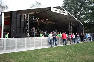 - ↑ Een overheidspublicatie in Australië noemt de Mojo Barrier een wereldwijd erkend hekwerk voor de uitdagingen van de 'mosh pit', in deze PDF, p 59. Gearchiveerd op 18 oktober 2022.